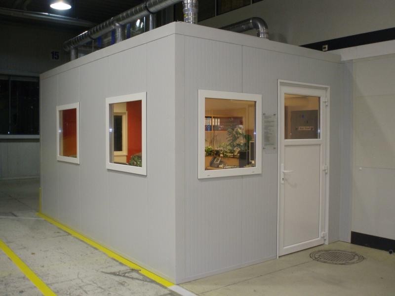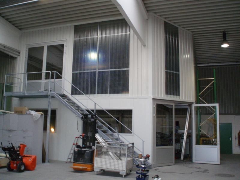 - Meisterbüro aus IPN-Dämmkern Paneelen und aufgestocktem Warenlager mit Trapezblechverkleidung