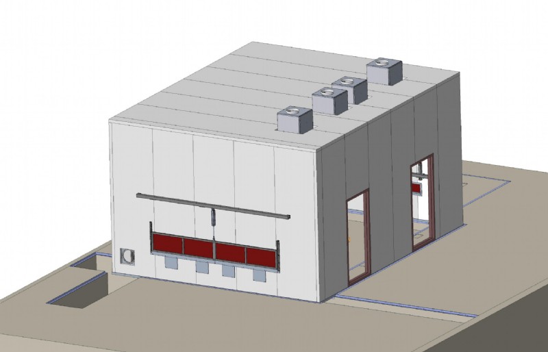 - Schallschutzeinhausung mit Gehtüren und Hubtore für eine Hochdruck-Wasserstrahl-Reinigungsanlage